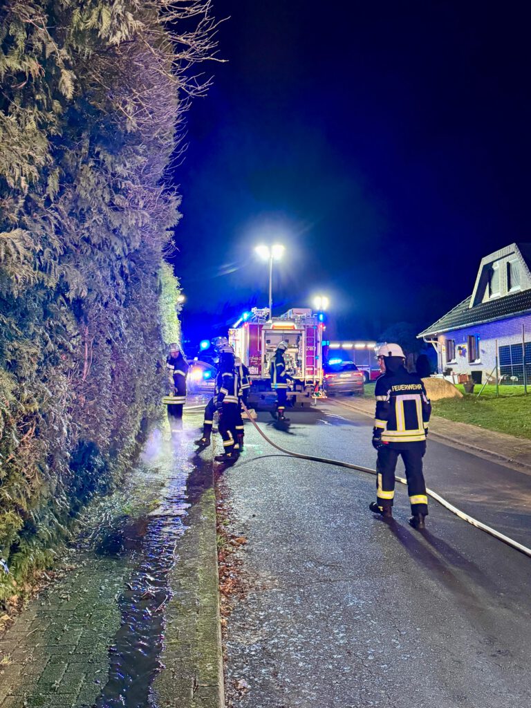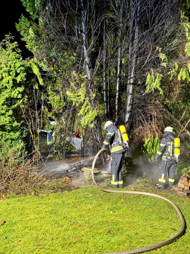 Unverzüglich wurde ein Löschangriff unter Atemschutz eingeleitet. Dabei kamen drei Strahlrohre zum Einsatz, um eine weitere Brandausbreitung auf angrenzende Bäume sowie den Carport zu verhindern. Das Feuer konnte zügig unter Kontrolle gebracht und vollständig abgelöscht werden. Die Brandursache war zum Zeitpunkt des Einsatzes unbekannt.